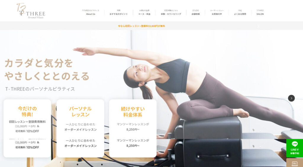 T-THREE(ティースリー)自由が丘は、完全個室・完全マンツーマンにこだわったパーソナルマシンピラティス専門スタジオです。他の利用者と顔を合わせることなく、集中できる環境で効果的なレッスンを受けられるのが特徴です。