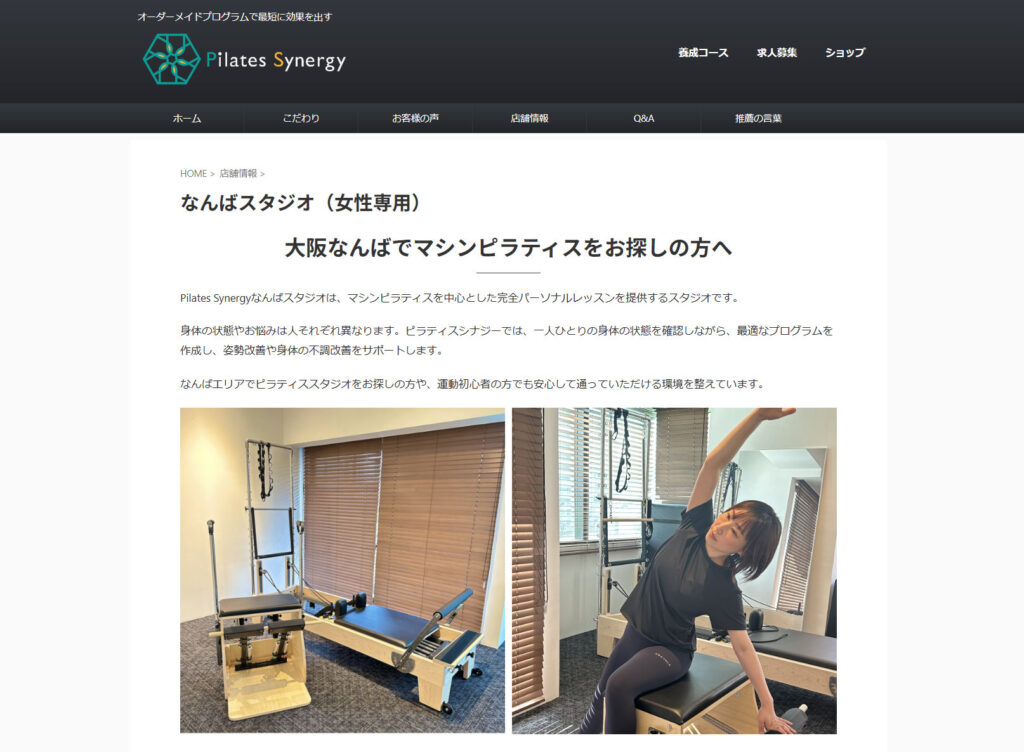 Pilates Synergy 大阪なんば店は、マシンピラティスを中心に、一人ひとりの身体の状態や目的に合わせた指導を行うスタジオです。姿勢改善やボディメイクをサポートするレッスンが用意されており、初心者から経験者まで幅広く対応しています。落ち着いた空間で集中してトレーニングできる環境も魅力です。